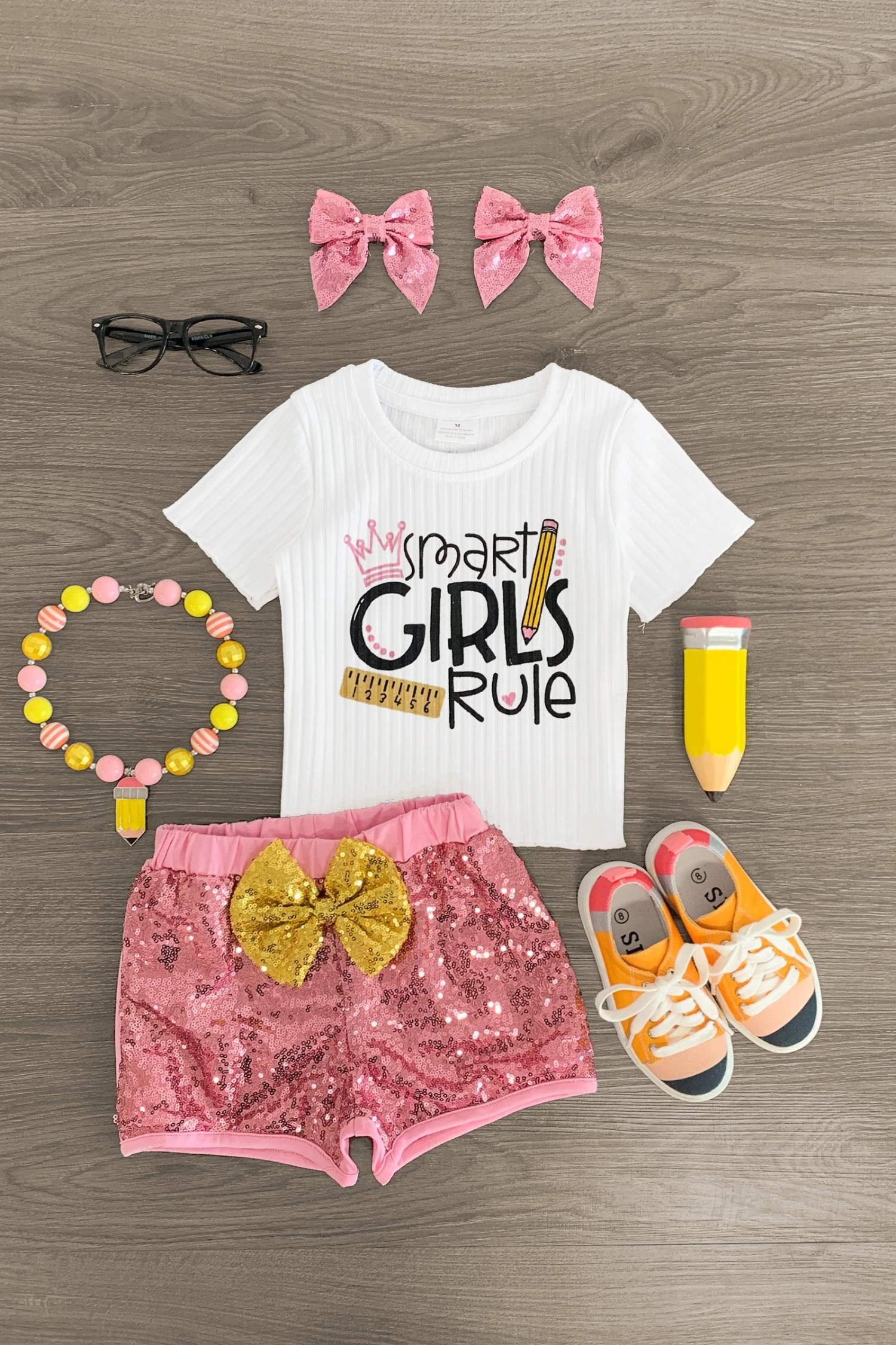 Add sweet fluttery style to her look with this “Smart Girls Rule” Pink Sequin Short Set. This girls’ set is styled with a white ribbed top that has a cute saying on the front, making it a staple addition to her everyday wear. The top is paired with adorable matching pink sequin shorts, creating an easy back to school look. The stretchy waistband provides a secure fit and all day comfort. She can pair this set with sandals or our fun SIP bows for the perfect look!