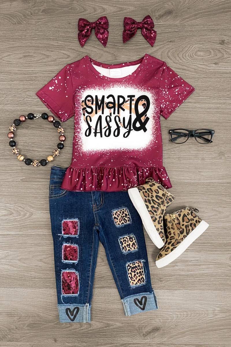 Your sweet little one will look oh-so adorable in our “Smart & Sassy” Sequin Denim Pant Set for girls. This burgundy top features a cute saying on the front as well as short sleeves & a peplum hem. This top looks adorable paired with the distressed denim pants. The adjustable waistband helps comfort and fit and can be great for on the go, while the peekaboo details add the perfect touch to her look. The top and pants can be worn as a set and paired with our matching bows or keep it laid back with our comfy booties, she’ll shine bright in this kids ensemble.