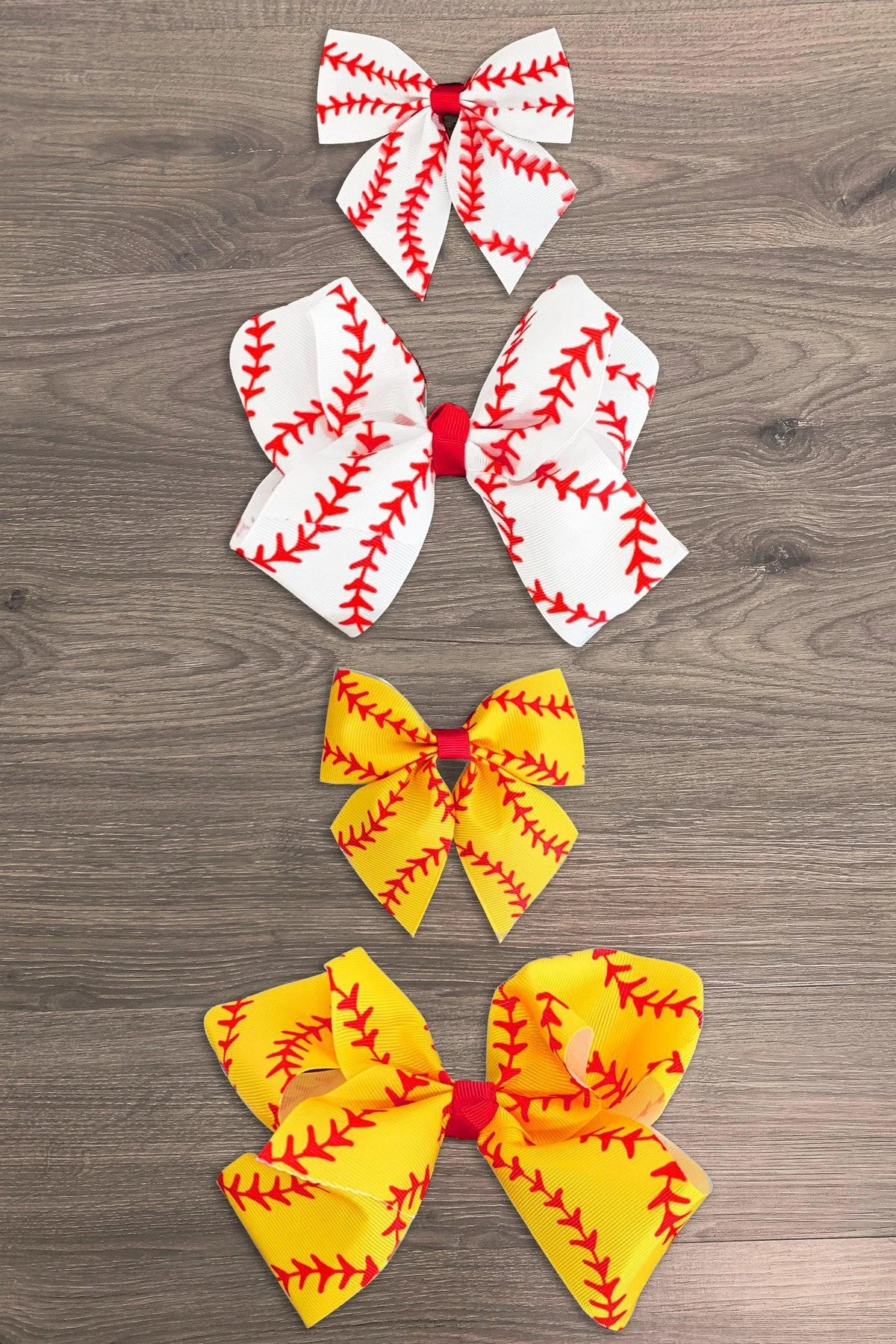 Add cute detail to her everyday hairstyles with our Softball & Baseball Bows. These bows feature a softball or baseball seam print and make a versatile addition to her hair accessories, and is easy to match with any outfit. The girly bows come attached to an alligator clip that makes it easy to clip into any hairstyle for easy styling. She can wear it with a range of hairstyles, from pigtails to ponytails, for sweet and simple accessorizing.