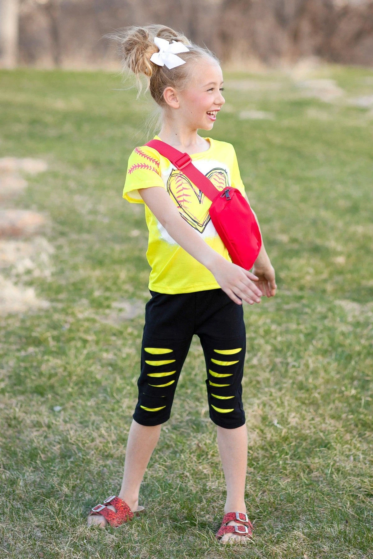 Your little one will look adorable cheering on friends and family at the ball park in our Softball Heart Distressed Capri Set. This girls’ set is styled with a yellow short sleeve top making it a staple addition to her summer wear. The top is paired with matching lined distressed capri leggings. The stretchy waistband provides a secure fit, and she can pair this set with sandals or our fun SIP bows or the perfect look!
