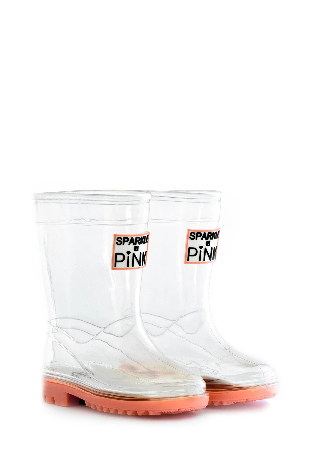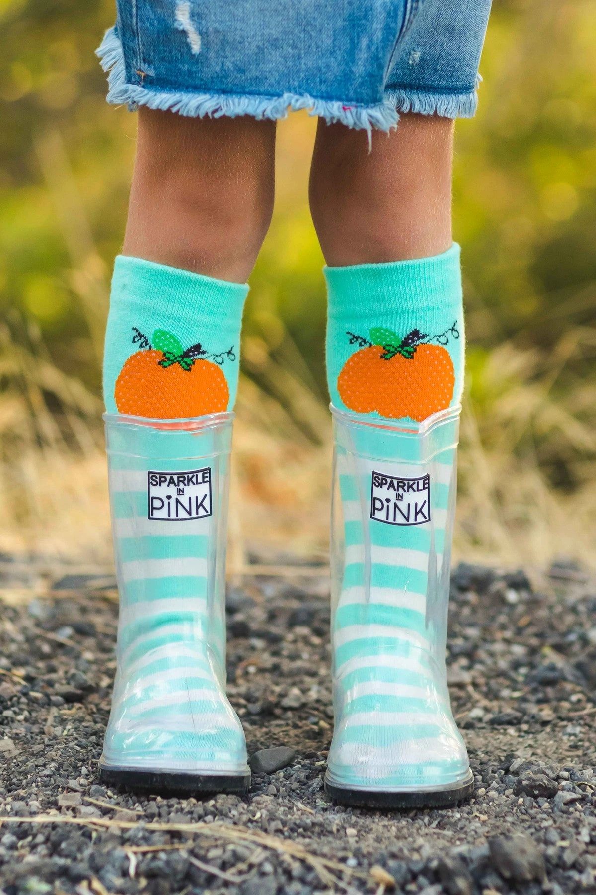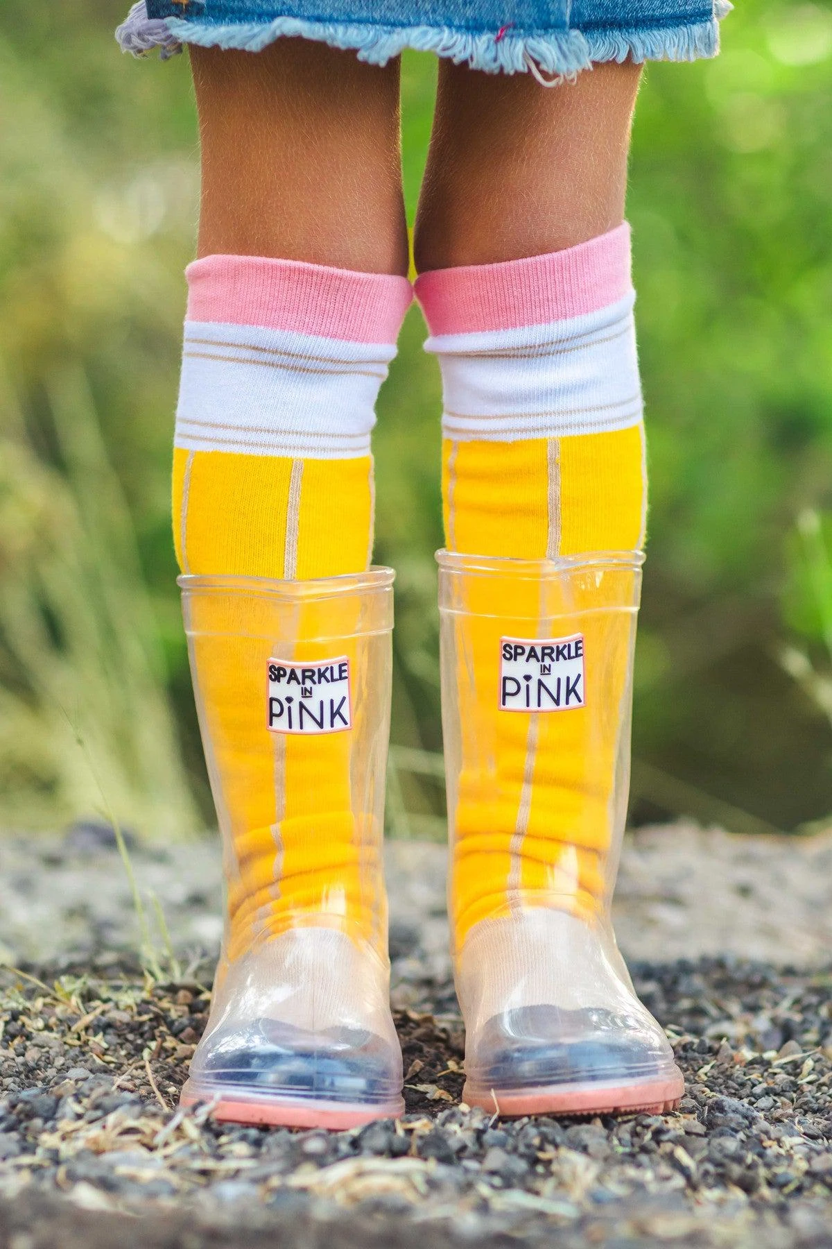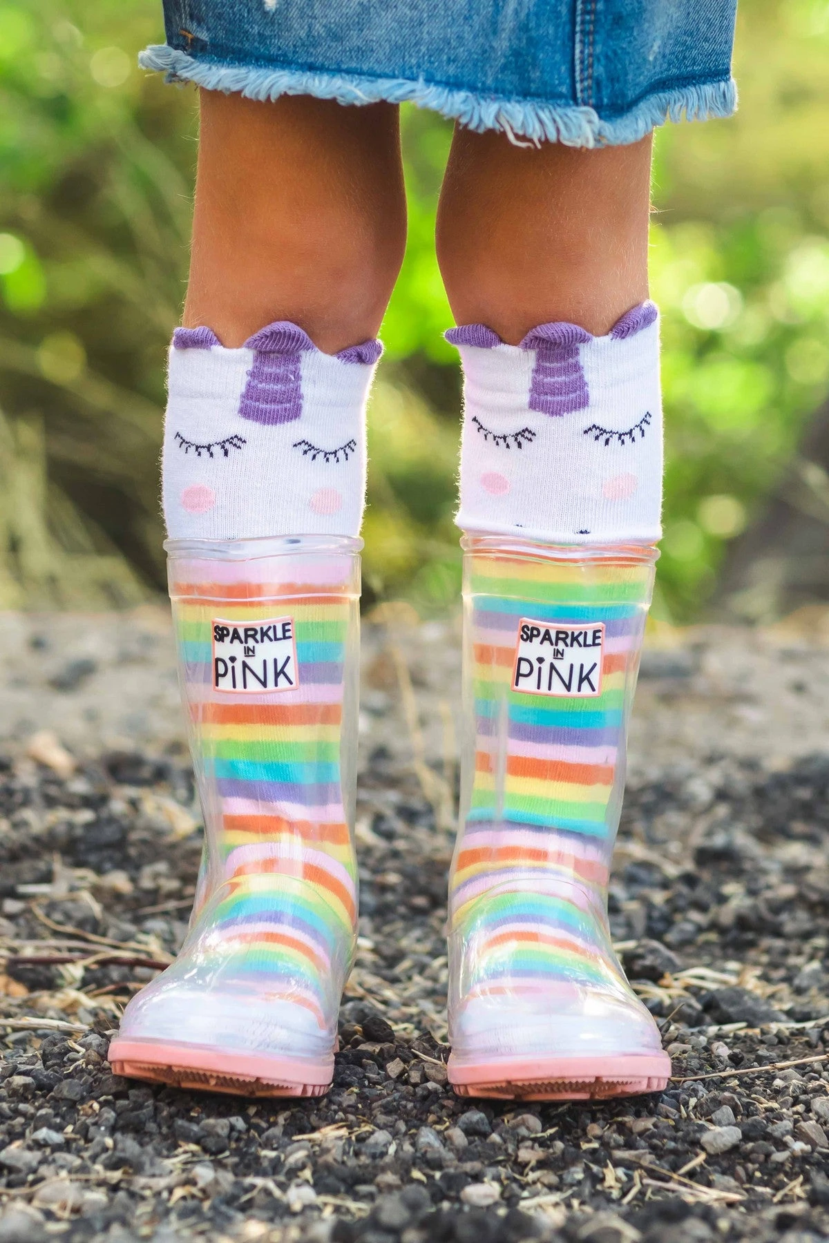 These boots are clear so you can wear with any fun socks underneath! We carry a bunch of fun sock options, perfect for everyday and Holiday themed socks! Your little one will step into rainy days in comfort and style with our SIP Exclusive Boots. Made from a durable rubber material, she will be ready to take on any weather. Pair with jeans, leggings, skirt and shorts!