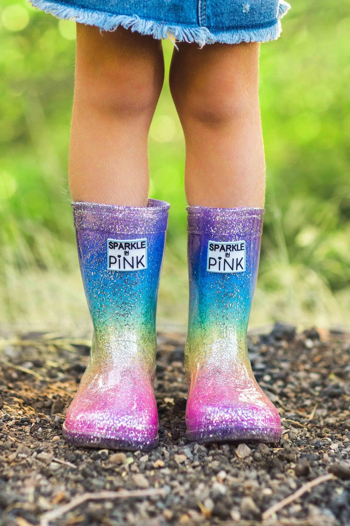 Your little one will step into rainy days in comfort and style with our SIP Exclusive Boots. Made from a durable material, she will be ready to take on the these rubber boots in any weather. In an allover glitter rainbow design that adds a touch of sweet style and shine to her dreary weather days, she’ll love wearing them over her favorite jeans or dresses for spending a day out in the rainy weather, without worrying about wet feet.