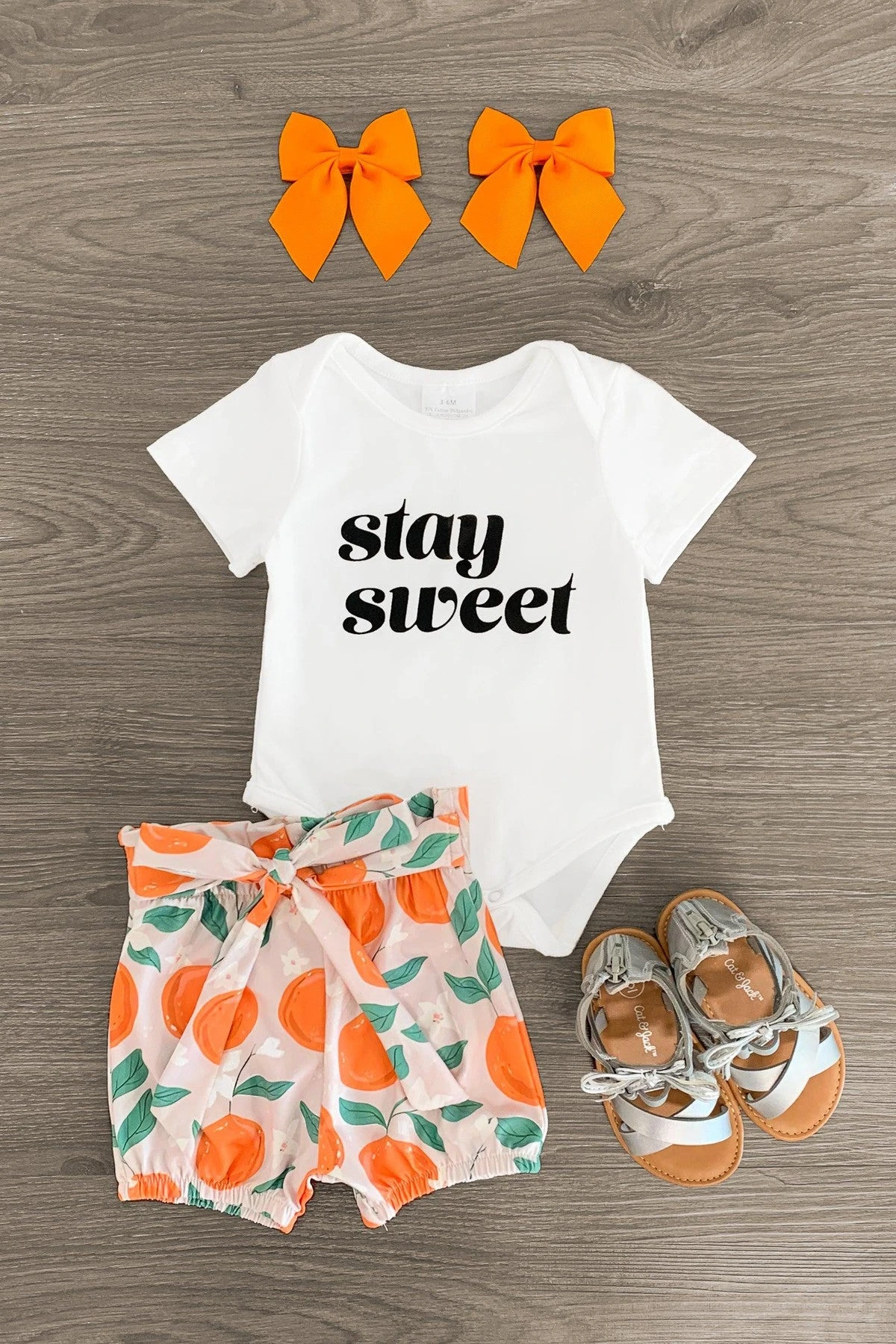Dress up your little one for the day in this “Stay Sweet” Peach Onesie Set. The set features a white onesie style top that looks adorable paired with the matching peach and floral print shorts. Mix and match these two pieces to create the perfect look! Check out our baby collection for more sets like this one!