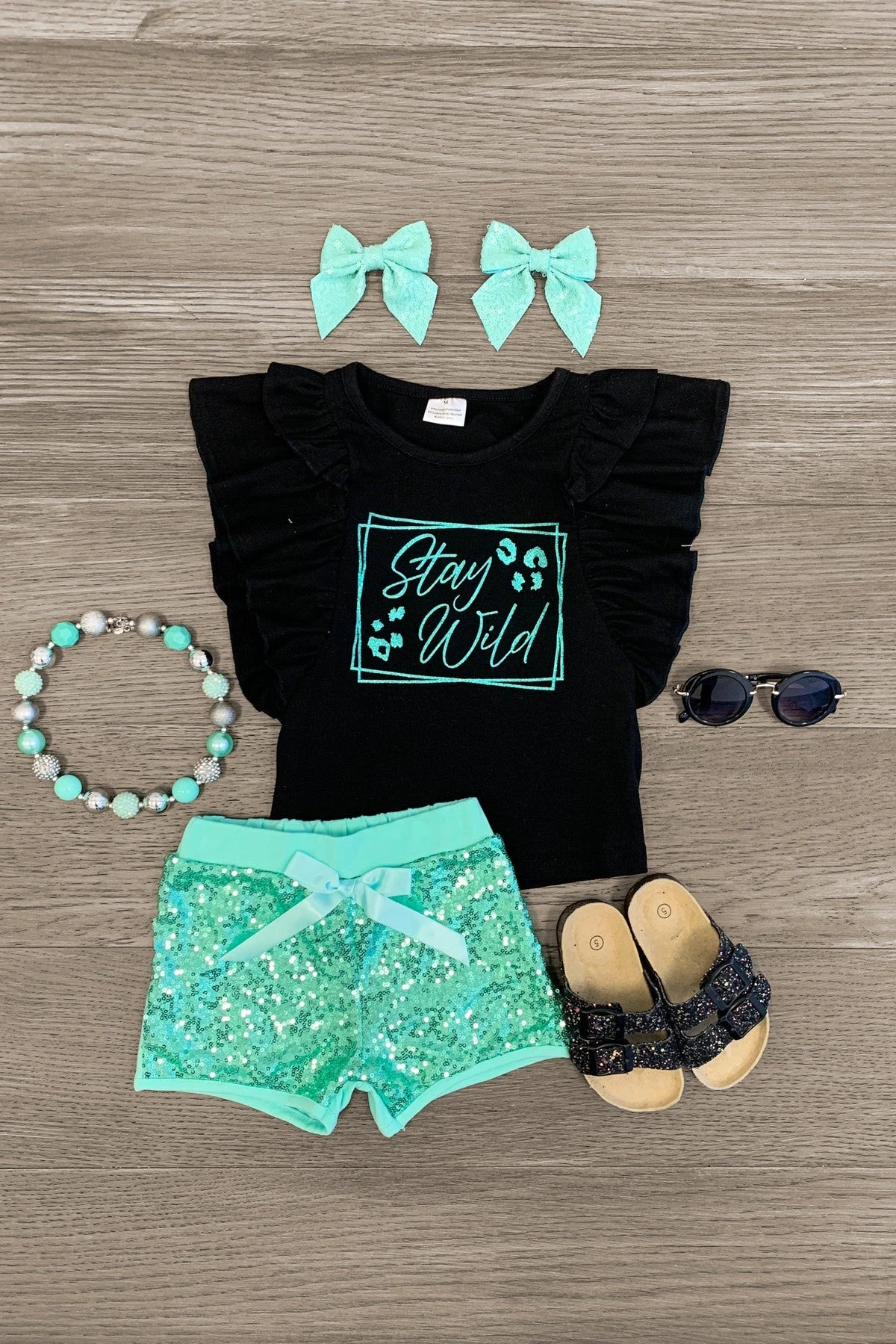 Bring on the warmer weather with this “Stay Wild” Mint Sequin Short Set for girls. This set features a black short sleeve top with “Stay Wild” on the front. This top is paired with matching shorts with a sequin-front design. The stretch waistband helps comfort and fit and can be great for on the go. The top and shorts can be worn as a set and paired with our matching bows or keep it laid back with a pair of sunglasses, she’ll shine bright in this kids ensemble.