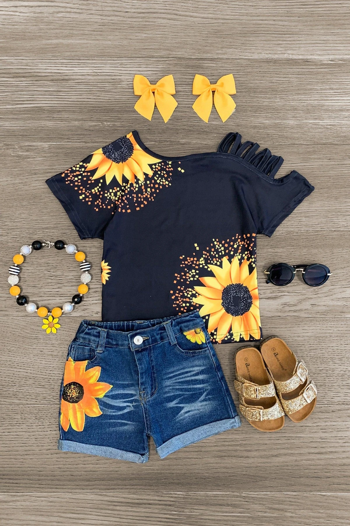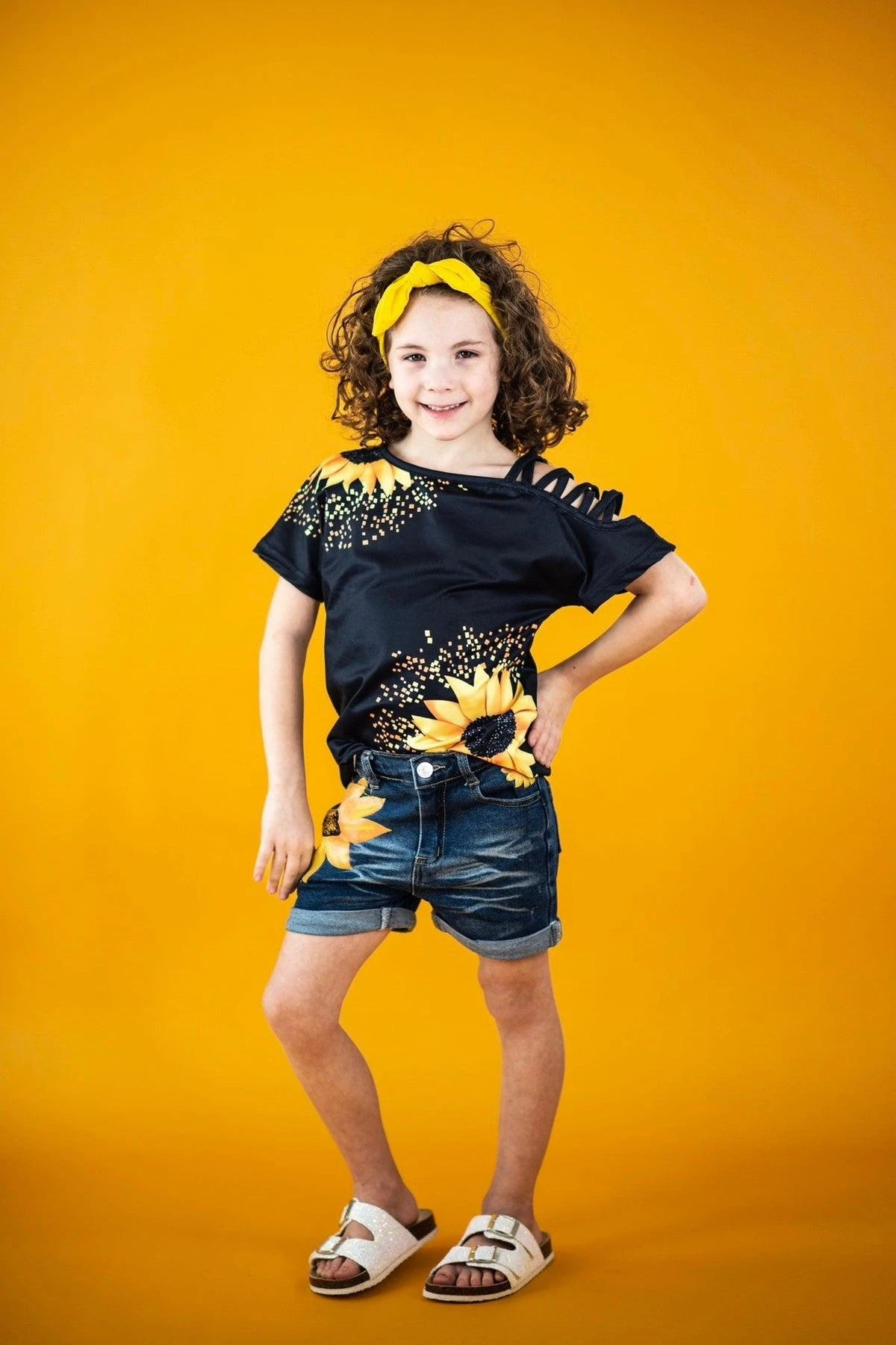 Bring on the warmer weather with this Sunflower Open Shoulder Denim Short Set for girls. This short sleeve top features a fun sunflower design and looks adorable paired with the matching denim shorts. The adjustable waistband helps comfort and fit and can be great for on the go, while the painted sunflower details add the perfect touch for Summer. The top and shorts can be worn as a set and paired with our SIP bows or keep it laid back with a pair of sunglasses, she’ll shine bright in this kids ensemble.