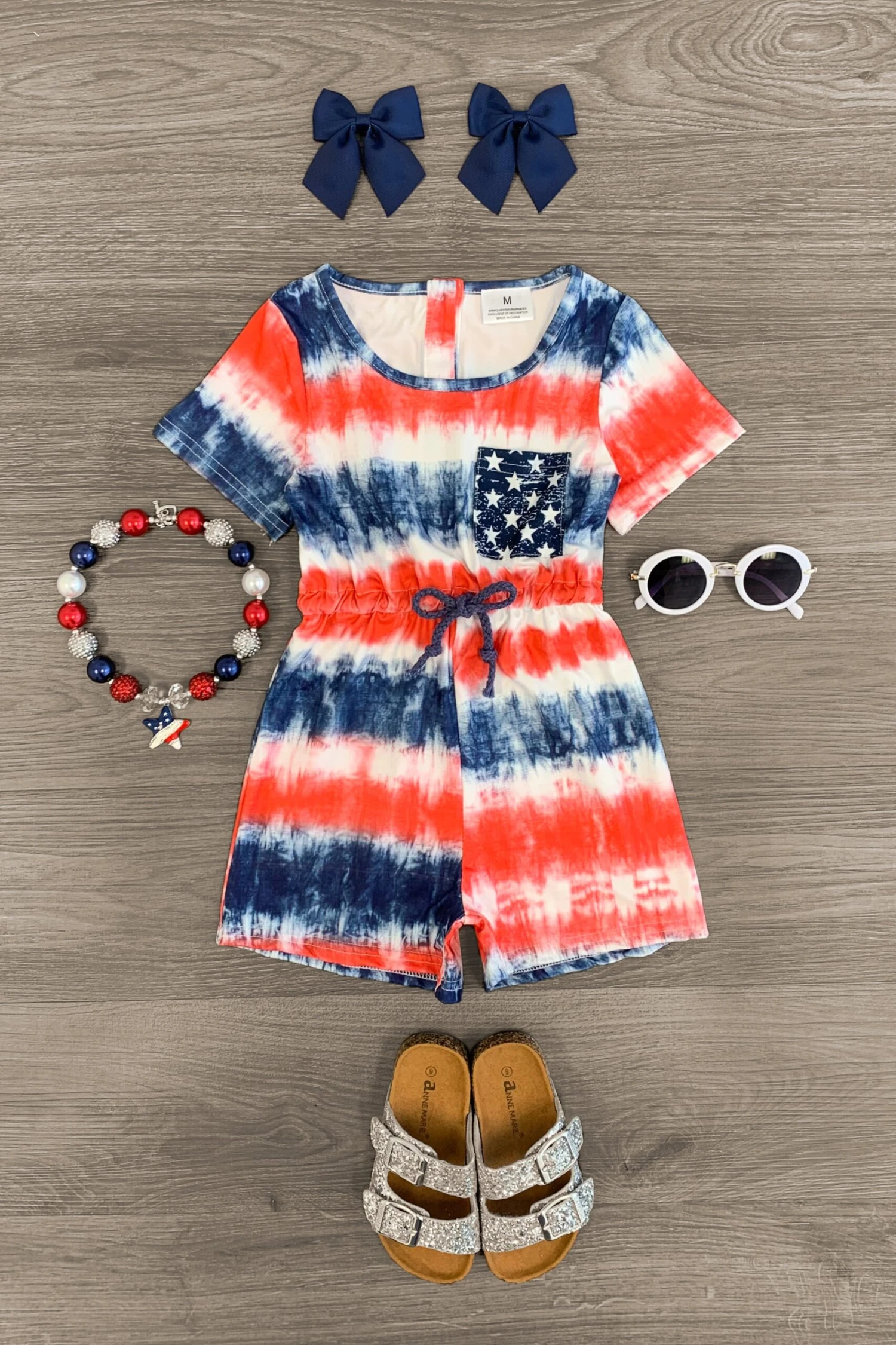 - Girls’ romper features an allover tie dye pattern with a star print pocket