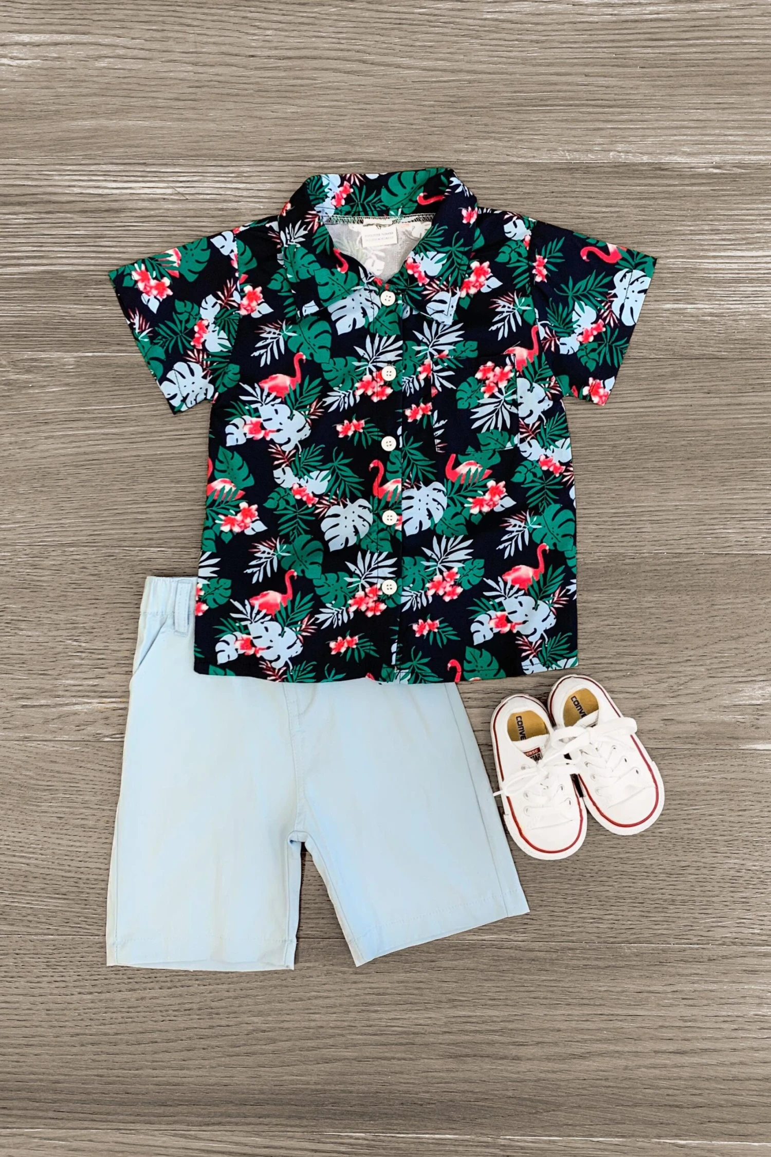 Bring on the warmer weather with this Tropical Flamingo Button Down Short Set for boys. This button-up top features a fun tropical print that adds a fun vibe to his look. This top looks adorable paired with the matching shorts. The stretch waistband helps comfort and fit and can be great for on the go, while the pull-on design gives his look a casual feel. He can mix and match these two pieces to create many handsome summer looks. Check out our boys’ collection for more outfits like this one!
