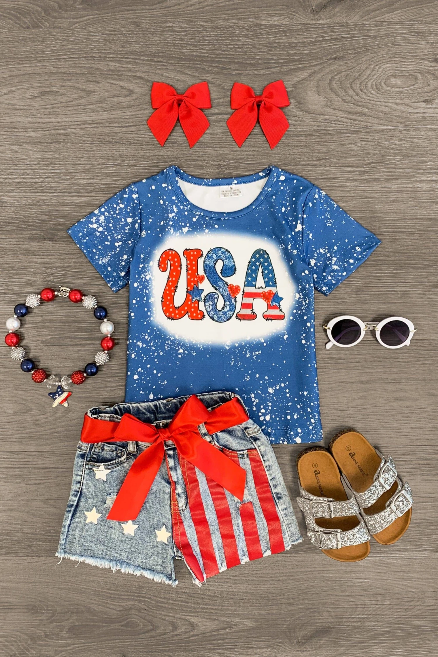 Bring on the warmer weather with this “USA” Stars & Stripes Distressed Denim Short Set for girls. This short sleeve top looks adorable paired with the matching denim shorts. The adjustable waistband and matching ribbon belt helps comfort and fit and can be great for on the go. The top and shorts can be worn as a set and paired with our sequin bows or keep it laid back with a pair of sunglasses, she’ll shine bright in this kids ensemble.