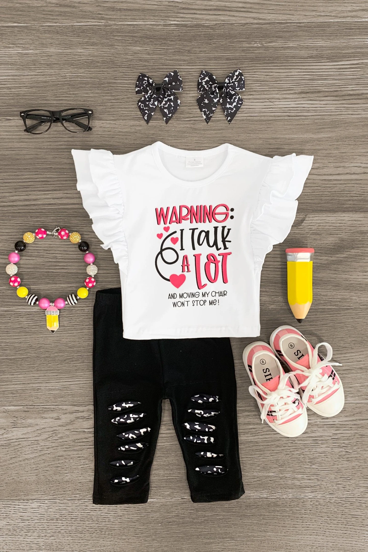 Your little one will look so cute at school in this “Warning: I Talk A Lot…” Distressed Legging Set for girls. The white ruffle top features a sweet back to school saying on the front and looks adorable paired with the leggings. The stretchy waistband helps comfort and fit, while the distressing adds an edgy touch to her look. The top and pants can be worn as a set and paired with our matching bows or keep it laid back with a pair of sandals, she’ll shine bright in this kids ensemble.