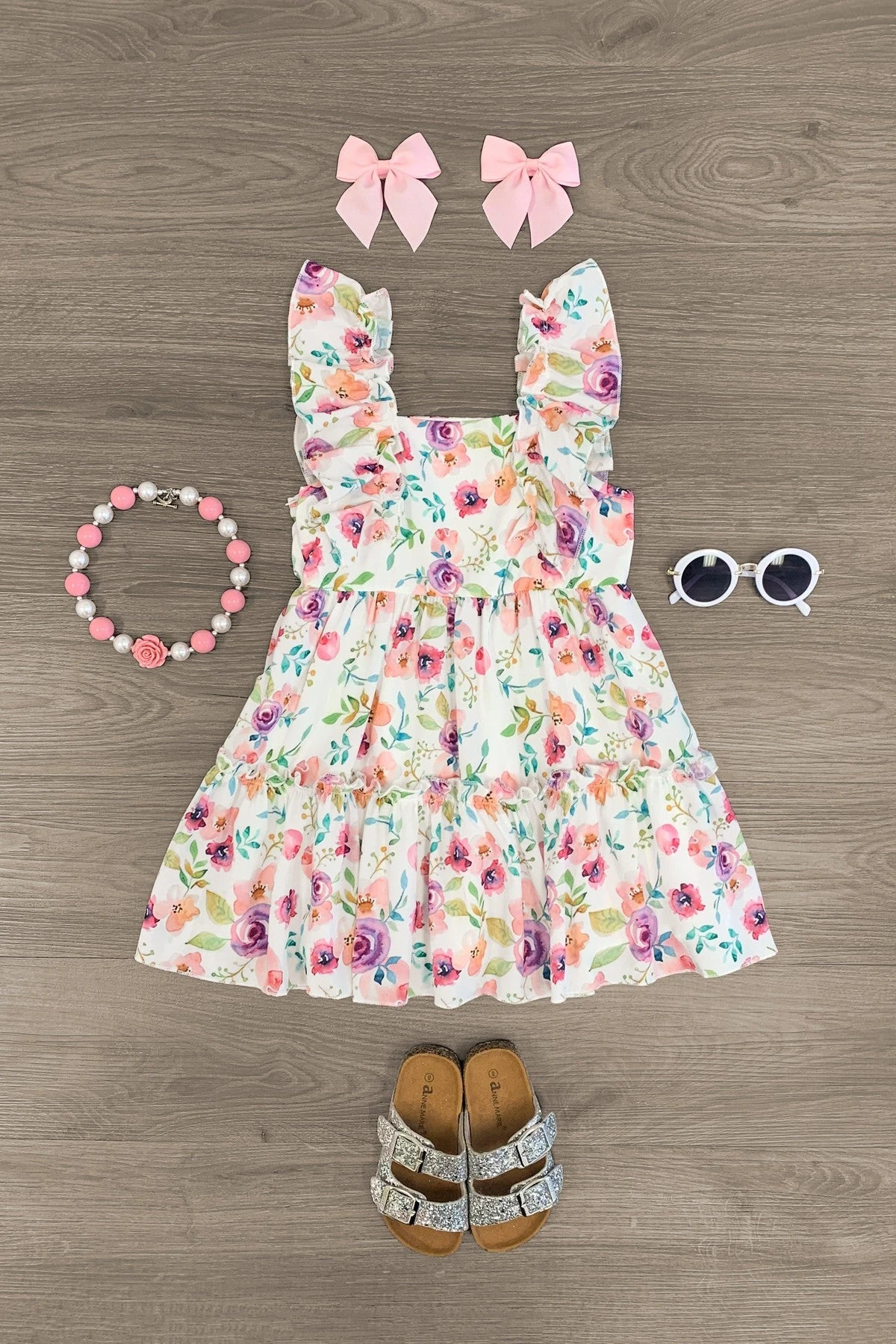 From backyard parties to a picnic in the park with family and friends, this Watercolor Rose Floral Ruffle Dress makes for a perfectly pretty pick for any occasion. Made from a soft & breathable fabric to let her breeze through the day in ease, this dress features an allover rose floral print with ruffle details for a sweet, feminine look. This dress pairs perfectly with our bows or cute sandals & when the weather gets a little cooler, simply layer on a cardigan and tights for an easy weather transition.