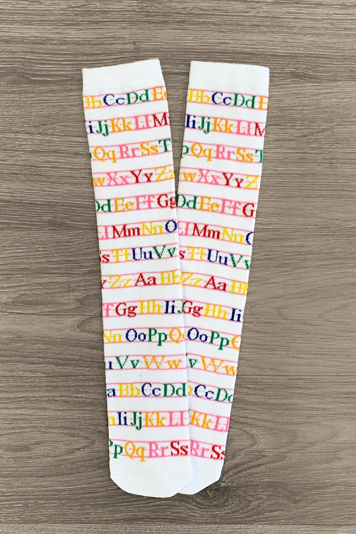 Whether she’s exploring the outdoors with friends or relaxing at home, your girl will be ready for another exciting day back at school in our White Alphabet Knee High Socks. Made from a durable fabric with added spandex, these girls’ socks provide her feet cozy and stretchy comfort, and they’re designed with banded cuffs that help keep them in place. Pair these socks with our clear rubber boots for the perfect look!