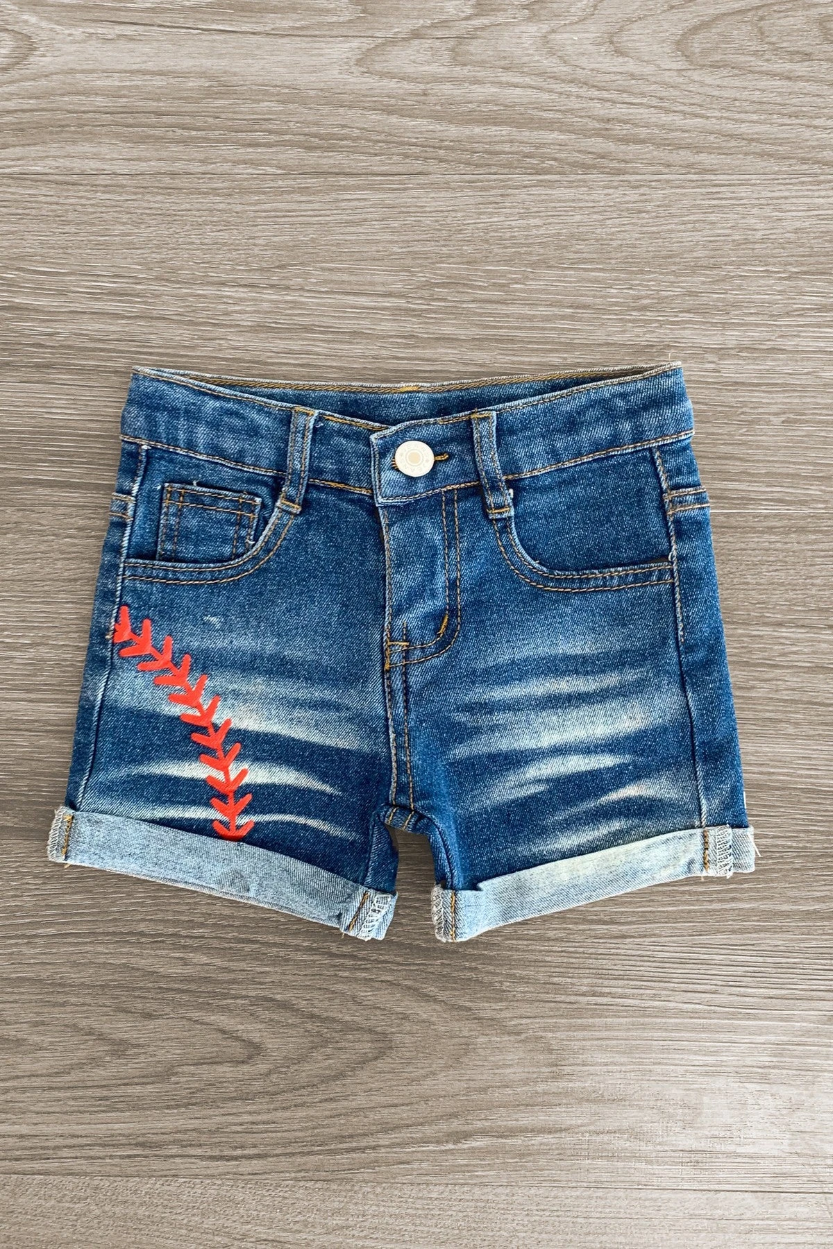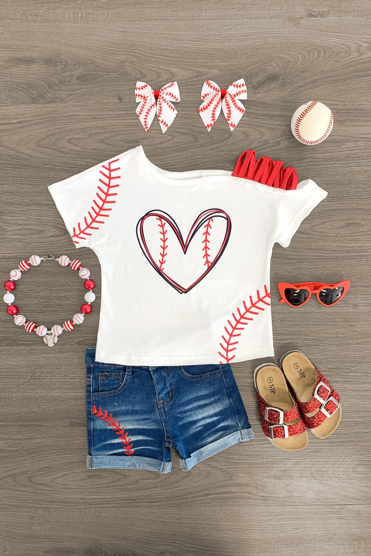 Your little one is going to be the cutest at the ballpark in our White Baseball Heart Denim Short Set for girls. The white short sleeve top features a fun baseball design on the front and looks adorable paired with the denim shorts. The stretch waistband helps comfort and fit and can be great for on the go, while the baseball seam detail adds a fun touch. She can pair this set with sandals or our fun bows for the perfect look!