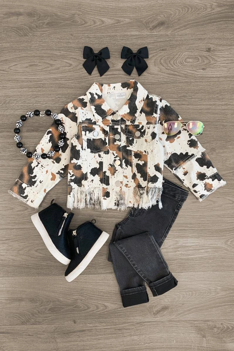 Your gal will love the comfort and cool style this White Cow Print Denim Jacket brings to her cool weather wardrobe. Made from soft & breathable fabric, this girls’ jacket feels soft against her skin, while the long sleeves offer her a cozy fit. Pair this jacket with our matching bows or booties for the perfect look!