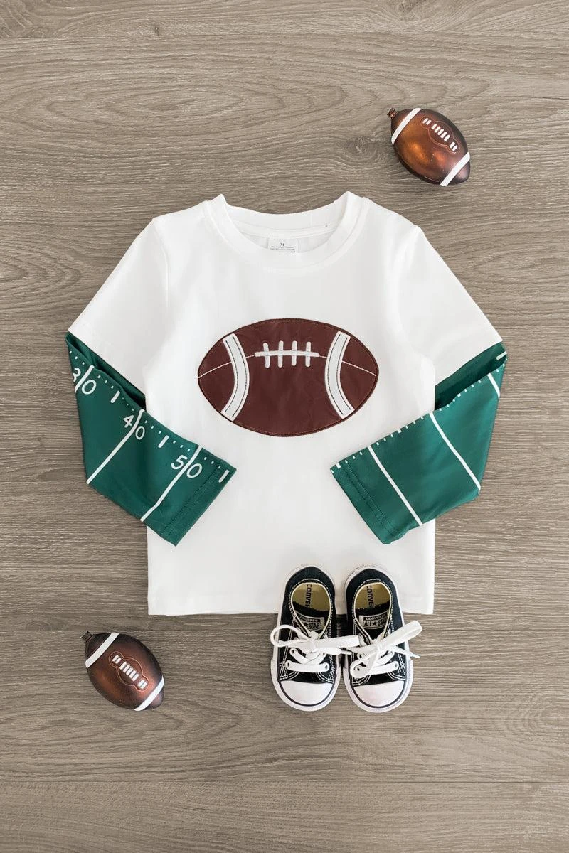 This White Football Long Sleeve T-Shirt for boys features long sleeves, and a fun football on the front. In a versatile style, this top is made from soft & breathable fabric that will keep your little one comfy during all adventures. Your little one can pair it with a variety of bottoms & a beanie for the perfect look! Check out the rest of our Thanksgiving collection!