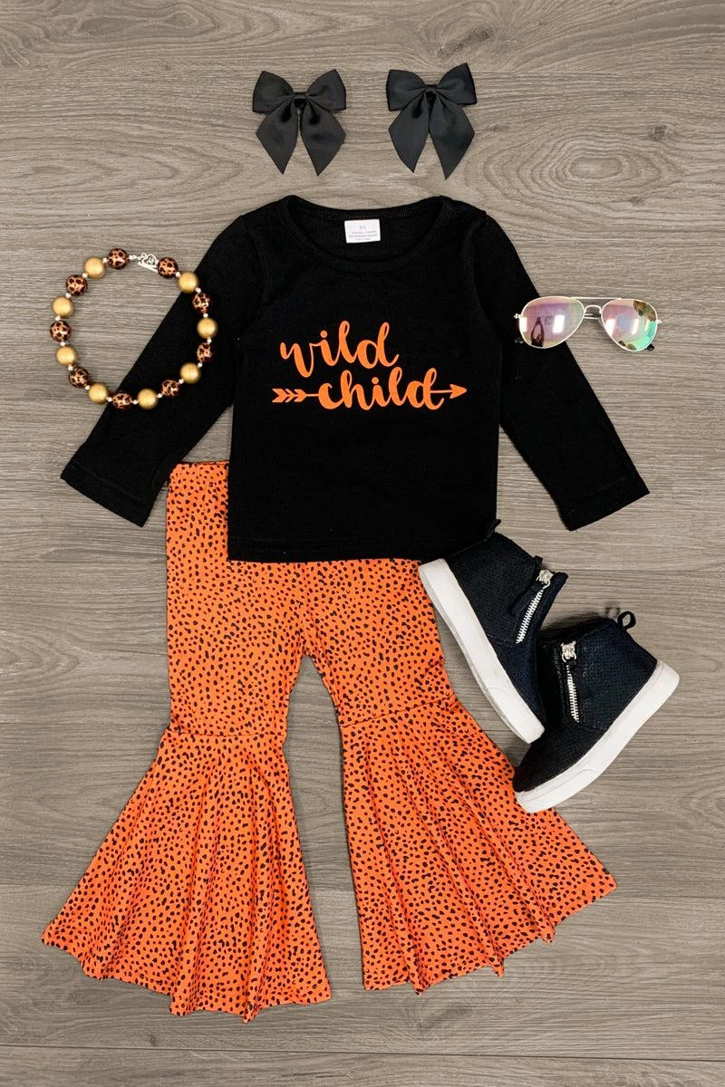 Bring on the cooler weather with this “Wild Child” Orange Bell Bottom Set for girls. This long sleeve top looks adorable paired with the orange spotted bell bottoms. The stretchy waistband helps comfort and fit and can be great for on the go. The top and bottoms can be worn as a set and paired with our SIP bows or keep it laid back with a pair of booties, she’ll shine bright in this kids ensemble.