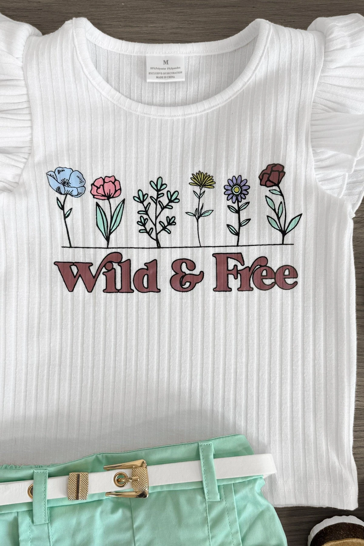 Step out in sweet style this season in our “Wild & Free” Mint Short Set. The white ruffle sleeve top features a fun design embossed on the front and looks adorable paired with the matching shorts. The stretchy waistband helps comfort and fit and can be great for on the go, while the mint color adds a fun touch. She can pair this set with sandals or our bows for the perfect look!