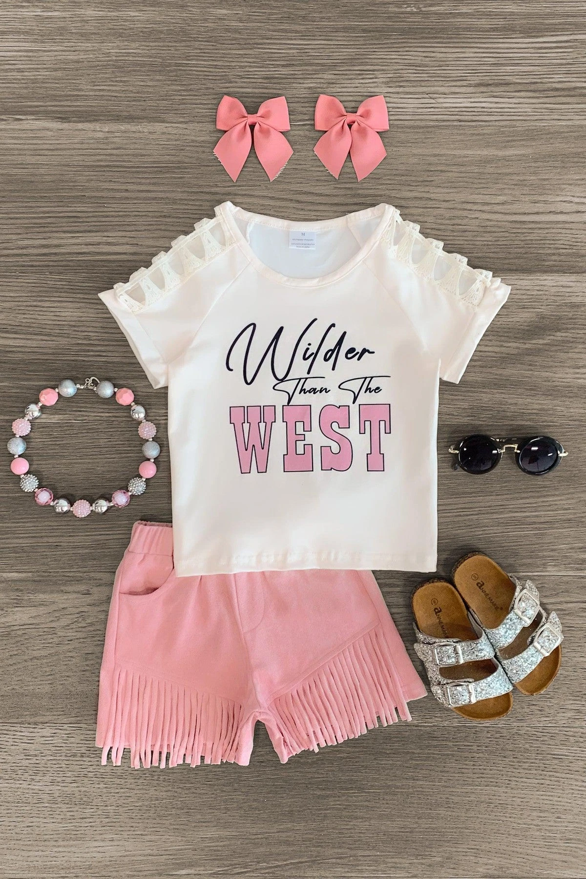 Bring on the warmer weather with this “Wilder Than The West” Pink Suede Short Set for girls. The crochet short sleeve top features an adorable design on the front and looks adorable paired with the pink suede shorts. The adjustable waistband helps comfort and fit and can be great for on the go, while the fringe trim adds a fun pop to her look. The top and shorts can be worn as a set and paired with our bows or keep it laid back with a pair of sunglasses, she’ll shine bright in this kids ensemble.