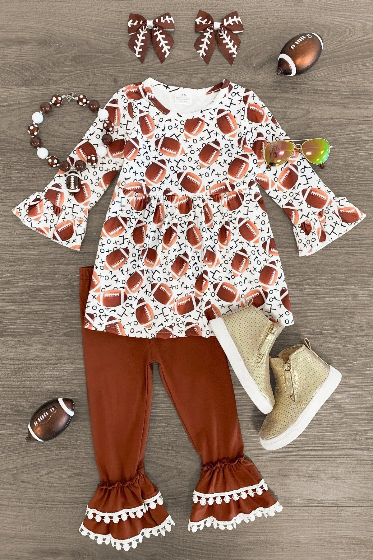 Get ready for football season with this “XO” White Football Pant Set for girls. This long sleeve top features a fun football design. This looks adorable paired with the matching ruffled leggings with pom-pom lace detailing. The stretchy waistband helps comfort and fit and can be great for on the go. The top and bottoms can be worn as a set and paired with our SIP bows or keep it laid back with a pair of booties, she’ll shine bright in this kids ensemble.