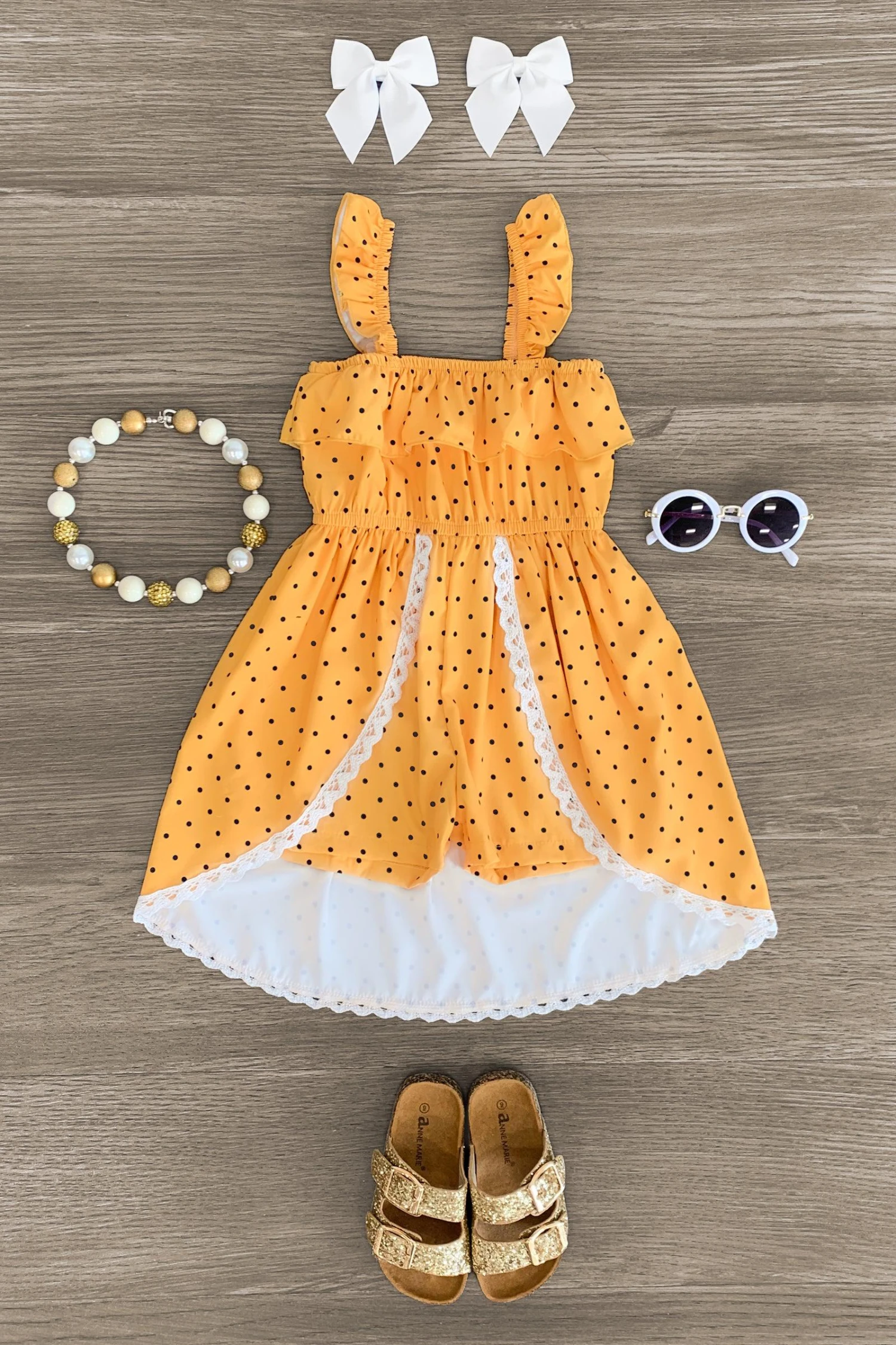 It’s a one piece complete outfit! She’s going to love this girls’ Yellow Polka Dot Skirted Romper for every occasion. The polka dot print brightens up every room and is perfect for warm weather activities. Run, jump, skip, slide, and climb in this versatile romper – pair with a couple trendy bows for the ultimate activity ensemble, or match with a cute pair of sandals for something a little more glam. Made with ultra-soft fabric & easy on and off design, this cute girls skirted romper is perfect for every occasion.